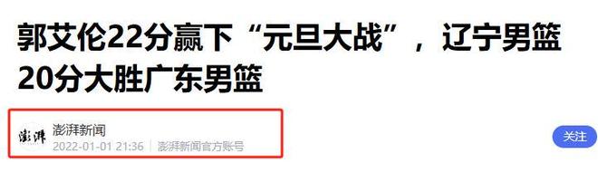 澎湃新闻|郭艾伦22分赢下“元旦大战”,辽宁男篮20分大胜广东男篮.2022