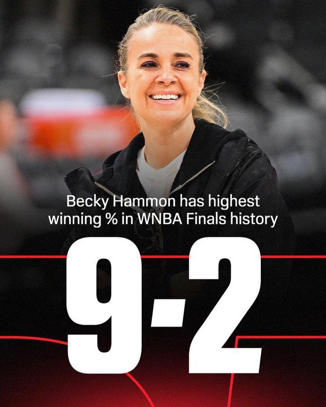 据ESPN统计,目前王牌主帅哈蒙带队在总决赛中的总战绩是9胜2负,胜率在WNBA高居历史第一。