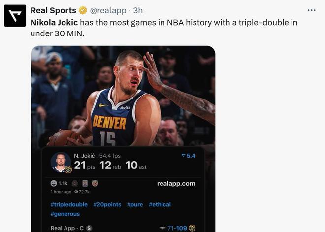 本场对阵鹈鹕队,约基奇27分钟三节打卡拿到21+12+10三双数据,开季至今4场比赛完成三双4连击神奇表现。