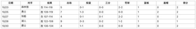 截至当天,杨瀚森常规赛5场比赛合计出场29分钟,合计9分、4篮板、2盖帽,投篮9投2中(22.2%)、三分3投0中、罚球6罚5中(83.3%)——防守干扰能力是其最大的亮点,身体对抗与犯规控制仍需适应。我贴一下每场比赛的明细(来自开拓者队官方赛后技术统计):
