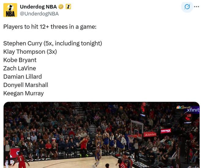 第三项:本场是库里生涯第5次单场命中12记三分,高居NBA历史第一,克莱以3次排名第二,NBA其余球员加起来一共5次做到;