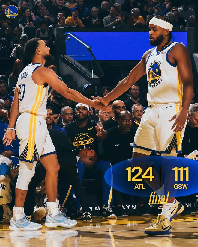 巴特勒命中2+1,随后强攻篮下被克雷伊奇封盖,巴特勒低位得分还以颜色,老鹰请求暂停。库里命中远投,佩顿抢断,库里上篮得分,勇士回敬10比0的攻势,亚特兰大请求暂停。奥孔武勾手得分为老鹰打破得分荒,佩顿勾手打进还以颜色,奥孔武2罚全中,老鹰连续远投不进,巴特勒打成了2+1。梅尔顿外线打铁,麦科勒姆轰进2+1,距离终场还剩3分16秒,勇士落后17分,科尔请求暂停并换下大部分首发。金州提前弃子认负,比赛就此失去了悬念。最终,老鹰以124比111完胜勇士,就此斩获了3连胜,金州的2连胜被终结。