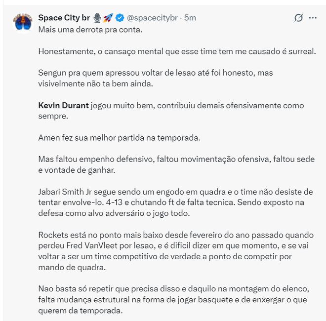 休媒总结了一下最近的三连败:我认为这支球队的精神疲惫才是关键,申京明显还没有痊愈就复出,杜兰特依旧打得不错,阿门险些打出赛季最佳一战虽然略有瑕疵,可全队缺乏防守强度,没有进攻积极性,缺乏对胜利的渴望。