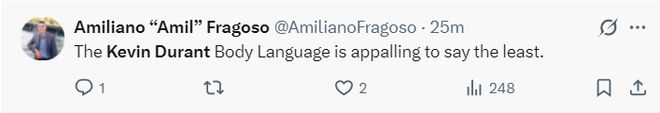 也有火箭球迷认为杜兰特的肢体语言太沮丧了。(第三节打了10分钟只有2个出手战意全无)