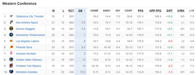 随着火箭队一波三连败,太阳队一波三连胜,太阳24胜13负,火箭22胜14负,太阳反超火箭成为西部第六,而火箭则跌入附加赛成为西部第七。
