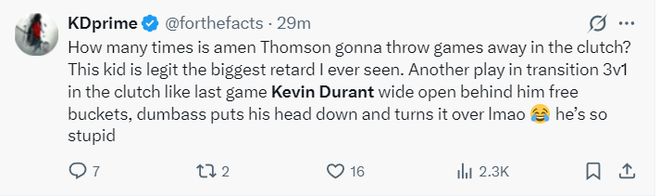 赛后休媒炮轰阿门-汤普森在关键时刻两次低级失误送国王6分,他认为阿门的选择太愚蠢,KD就在他身后无人防守他都能传丢。