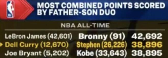 库里父子戴尔-库里与斯蒂芬-库里总得分38920分,超越布莱恩特父子科比与乔-布莱恩特38895分,升至NBA历史父子得分榜第二位,仅次于詹姆斯与布朗尼父子合计42692分。
