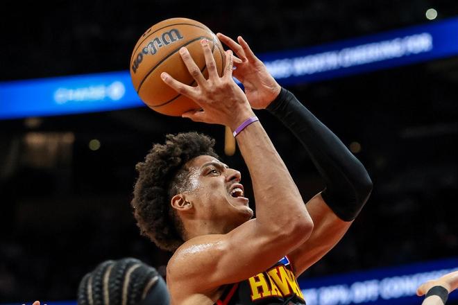 半场数据,老鹰队这边,杰伦-约翰逊出战16分钟9投7中,其中三分球2投1中,罚球4投2中,得到17分8篮板4助攻1盖帽。